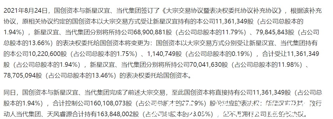 截至公告披露日2021年8月24日,国创资本与新星汉宜及其一致行动人当代集团、天风睿源所签署的《合作协议》及其相关协议所涉及事项已全部实施完成。